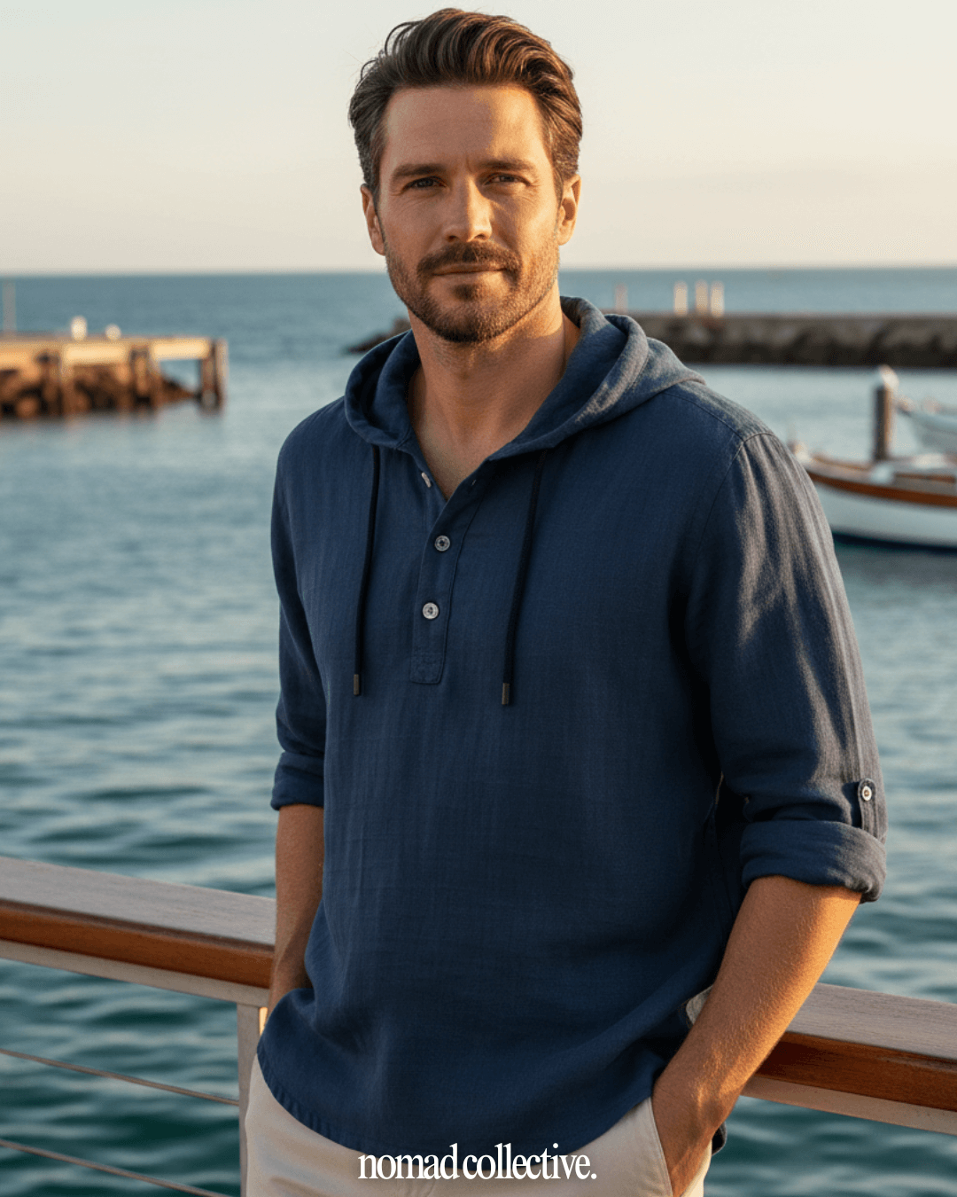 The lightweight, breathable texture of linen feels naturally soft against the skin, making it ideal for year-round wear, while the adjustable hood adds a modern, functional touch. Perfectly balanced between sophistication and ease, it transitions seamlessly from active days to relaxed evenings.